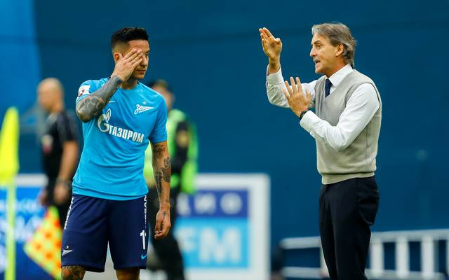 Italiens trainer roberto mancini steht mit ball in der hand an der seitenlinie.